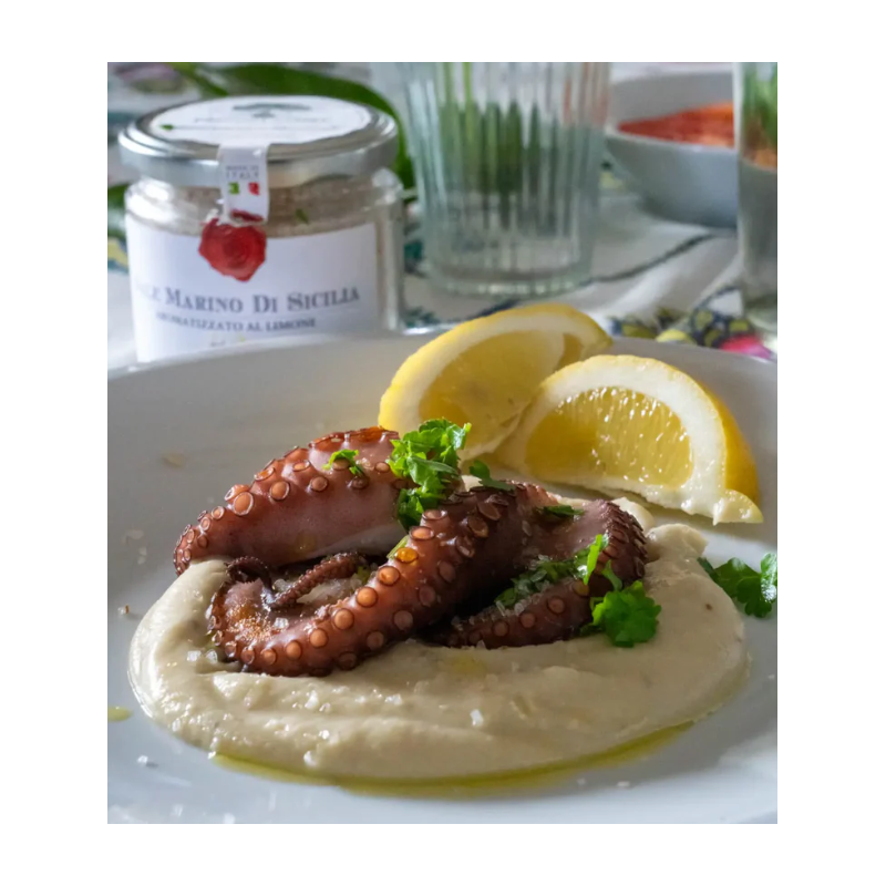 Přírodní mořská sůl z tradičních sicilských solných pánví, obohacená o sušenou citronovou kůru. Vyrábí se řemeslným způsobem a zachovává si autentickou chuť i aroma typické pro Sicílii.