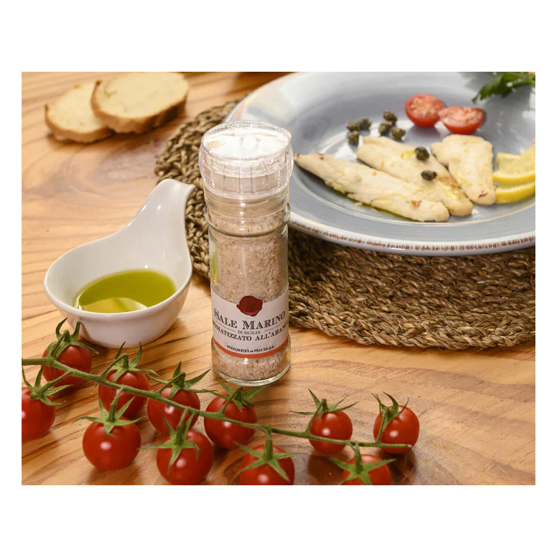 Přírodní mořská sůl z tradičních sicilských solných pánví, obohacená o sušenou pomerančovou kůru. Vyrábí se řemeslným způsobem a v praktickém mlýnku si zachovává intenzivní aroma i čerstvost.