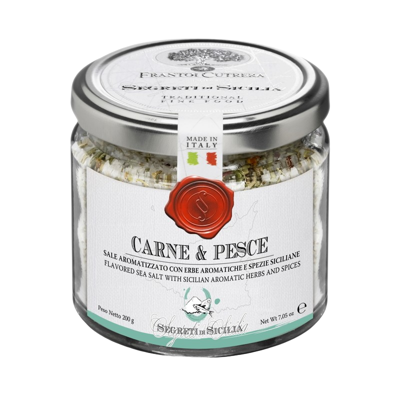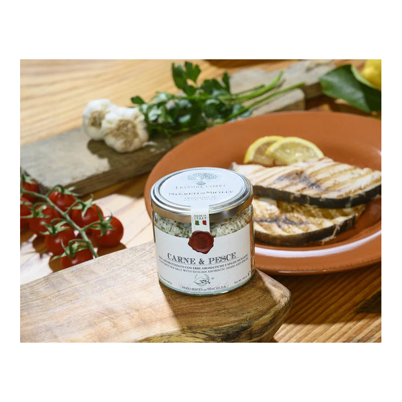 Aromatická mořská sůl z tradičních sicilských solných pánví, obohacená o směs bylinek a koření typických pro středomořskou kuchyni. Díky šetrnému zpracování si zachovává intenzivní vůni i chuť, která připomíná autentickou Sicílii.